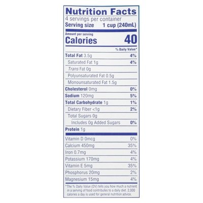 Almondmilk coconutmilk blend. Vanilla with other natural flavors. 40 calories per serving. Dairy & lactose-free. Gluten free. Soy-free. Egg-free. 50% more calcium than dairy milk (1 cup of regular dairy milk contains 300mg calcium vs 1 cup of almond breeze contains 450mg calcium). Almond Breeze: 35% DV (450mg); Dairy Milk: 25% DV (300mg) (1 cup of regular dairy milk contains 300mg calcium vs 1 cup of almond breeze contains 450mg calcium). Excellent source of vitamin E. Cholesterol free (Almondmilk, a cholesterol-free food). Non GMO Project verified. nongmoproject.org. The best almonds make the best almondmilk. Every cup of Almond Breeze is carefully crafted with the best almonds. For over 100 years, our co-op of California family owned orchards has been dedicated to growing the Blue Diamond almonds that give Almond Breeze the delicious, creamy taste you'll love. - Ken and Jason Chandler. Growers for 3 generations. No MSG. Carrageenan-free. Casein-free. Taste Guarantee: If you are not satisfied with the taste, we guarantee your money back. For specific details, visit almondbreeze.com. almondbreeze.com. how2recycle.info. Scan for an exciting experience! Facebook: Find us on Facebook. SmartLabel. Scan barcode with SmartLabel app for more information. Questions or comments? Contact Blue Diamond customer support at 1 (800) 987-2329 or support(at)bdgrowers.com. Please include code number found on pack with all inquiries. almondbreeze.com. To learn more, please visit us at www.bluediamond.com/faqs or scan product UPC code for SmartLabel page. Rainforest Alliance Certified. FSC: Mix - Board from responsible sources. www.fsc.org. How We Make a Difference: California Almond Growers have reduced their water usage by 33% for every 1 lb of almonds grown. Almondmilk produces 78% less carbon emissions than dairy milk. We partner with Project Apis m. to help honeybees thrive before, during and after the almond bloom.