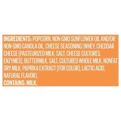60 calories per cup. Certified gluten free. gfco.org. 100% Whole grain popcorn. See nutrition information for fat and sodium content. Non-GMO. Real, simple ingredients. Nothing fake. Everything is better with cheddar. A Pop of Positivity: Back when Dan and I first started popping popcorn in our garage in Mankato, Minnesota, we wanted to teach our kids the value of hard work and have a little fun along the way. We also wanted a snack we felt good about feeding them. Hugely flavorful snacks packed with positivity, not guilt. Snacks that keep the joy in everyday snacking (and snacking and snacking). With bright bags that radiate all the love and fun that went into them from the beginning. After all, isn't that what snacking should be about? We couldn't agree more. Our Cheddar Cheese flavor is made with real, simple ingredients - you know, ingredients you don't have to scrunch up your face to say - and nothing fake - so all of its ingredients are sourced from nature. Enjoy. XO, Angie. www.boomchickapop.com. how2recycle.info. Scan for more food information or call 1-800-252-0641. SmartLabel. Questions or comments, visit us at www.boomchickapop.com or call 1-800-252-0641.
