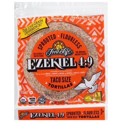 0 g added sugar per serving. USDA Organic. Certified Organic by QAI. Certified Organic: Quality Assurance International. Vegan. Complete Protein Plant: 100% Vegan. Whole Grain 35 g or more per serving. Eat 48 g or more of Whole Grain daily. WholeGrainCouncil.org. No preservatives. Non-GMO: Certified by NSF. The Live Grain Difference! See back panel for details. Natural. Delicious & nutritious. The original ancient recipe. As Described in the Holy Scriptures: Take also unto thee wheat, and barley, and beans, and lentils, and millet, and spelt, and put them in one vessel, and make bread of it - Ezekiel 4:9. Low Glycemic: Certified by the Glycemic Research Institute, Washington, D.C. Ezekiel 4:9 Tortillas are as delicious as they are nutritious! This Ancient Recipe is made exceptional by combining only fresh sprouted grains without any refined flour, artificial ingredients or preservatives. Rich in protein, complex carbohydrates, vitamins, minerals, and important exceptionally rich, nutty flavor. Truly the staff of life! The miracle of the sprouts! The original. Low glycemic. Different from most tortillas today, Ezekiel 4:9 tortillas are made from freshly sprouted Live grains and contain absolutely no flour. Our exclusive sprouting process releases important enzymes which maximize nutritional content and promote better digestion. Beneficial enzymes are released to help breakdown starches, carbs and proteins like phytic acid to promote better nutrient assimilation. We believe this is an important aspect in promoting overall health, vitality and longevity-to get the most out of whole grains! And even better still, our exclusive process preserves these valuable nutrients and retains the important natural fiber + bran. See the difference fresh sprouts really make. Your body and tastebuds will know the difference! SproutSmart. Why we sprout our grains. Releases enzymes to break down antinutrients. Maximize nutrition. Promotes digestibility. Preserves important natural fiber. Increases antioxidants such as vitamin C. Promotes a more balance pH. Breaks down starches +carbs. Reduces glycemic index. A remarkable plant protein! Contains all 9 essential amino acids. Ezekiel 4:9 tortillas are an amazingly nutritious 2,500 year old prodigy of the original bread found in the bible, and have all of the right ingredients to create a complete plan protein today, containing all 9 essential amino acids, with 18 in all from all plant sources. Now that's remarkable!. No yeast. No added oil. No baking powder. Healthy traditions. BioChecked Non Glyphosate Certified. www.foodforlife.com. Connect with Us Online: Facebook; Twitter; Pinterest; Instagram. To find creative tortilla recipes, go to www.foodforlife.com/recipes/tortillas. Email: info(at)foodforlife.com. Please recycle this package. Product of USA.