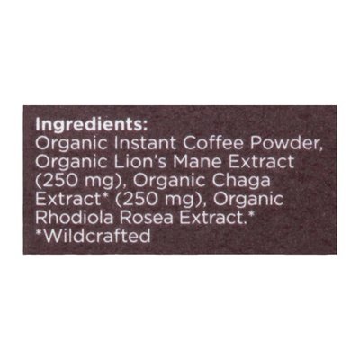 0 g sugar. USDA Organic. Certified Organic by CCOF. Vegan. Keto. Instant 50 mg caffeine. Your Brain's Best Friend: Not just organic Arabica coffee. But also Your brain's BFF lion's mane mushroom. Elevate your day with about half of the Caffeine as a regular cup of coffee. Arabica coffee. Flavor: Medium + Smooth. Every day magic. FourSigmatic.com. We love to chat so much! Email: support(at)foursigmatic.com, phone: +(213)699-4616, text: +(213)699-4616, online: FourSigmatic.com. Made in the USA with foreign ingredients.