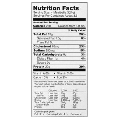 Gluten free. No wheat or gluten. No milk or casein. No eggs. No peanuts or tree nuts. No soy. Made with chicken raised with no antibiotics. Good source of protein. Good source of protein. 0 g trans fat per serving Trust made simple. Made with white meat chicken. For food safety must be cooked to an internal temperature of 165 degrees F as measured by a thermometer. Ian's Allergy-Friendly (This product does not contain any ingredients derived from wheat, soy, eggs, milk, tree nuts or peanuts) Gluten Free Chicken Meatballs are made with cage-free (Chicken flock was able to freely roam a building, room or area with unrestricted access to food and fresh water during their production cycle) white meat chicken raised without antibiotics. Enjoy our other meals including Chicken Nuggets, Fish Sticks, Turkey Corn Dogs, Alphatots and Onion Pings. Made with Cage-Free (Chicken flock was able to freely roam a building, room or area with unrestricted access to food and fresh water during their production cycle) white meat chicken raised without antibiotics. Inspected for wholesomeness by U.S. Department of Agriculture. www.iansnaturalfoods.com. Facebook. Twitter. Pinterest. See our entire line-up of meal solutions and culinary creations at www.iansnaturalfoods.com. 100% recycled paperboard. This packaged is recyclable; please recycle. Made in USA.