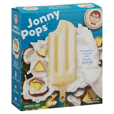 Pineapple & coconut with fresh cream. 100 calories. Gluten free. Peanut free facility. Now with 4 pops. Smoothie-on-a-stick. A Better Pop: The simpler the ingredients, the more delicious the pop. It's why we use a few wholesome ingredients - like fresh Midwest dairy - and blend small batches with care. It's as simple as that! For a Better World: In honor of our namesake, Jonathan, kindness is at the center of all we do. It's why you'll find a good deed printed on every stick. We believe sharing kindness through actions big and small is the best way to make the world a better place. Want to help? Share a JonnyPop and see what happens! Simple ingredients. A better pop for a better world! jonnypops.com. Let's chat! 651-243-0705. Chocolate Fudge. Strawberries & Bananas. Pineapple & Coconut. Mint Chocolate Dip. Summer Strawberries. Chocolate-Dipped Cherries. Raspberries & Blueberries. Root Beer Float. Mangos. Choco Latte. Chocolate- Dipped Strawberries. Made in U.S.A.