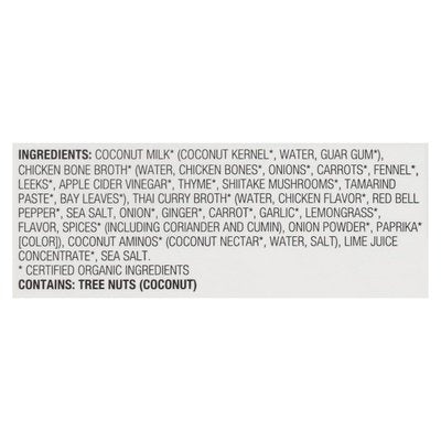 5 g total carb per cup. USDA Organic. Certified Organic by Oregon Tilth. Certified gluten free. gfco.org. Keto. See nutrition information for total fat, saturated fat and sodium content. Non-GMO Project verified. nongmoproject.org. No preservatives. Classic curry meets bone broth. We blended organic coconut milk into our organic chicken bone broth - then added traditional Thai curry broth and organic coconut aminos for a spicy-sweet take on sipping broth. At Kettle & Fire, we're not just making good food. We're making it our mission to improve the way we eat, starting from the ground up. It's why we partner with farms that reflect our core values, why we carefully source our ingredients, and why we slow simmer our bones at the perfect temperatures. From our people to our packaging, we believe every step of our process is another opportunity to do things better. We're committed to making positive changes in our food system - and we hope you'll join us. Whole 30 Approved. whole30.com. Glyphosate: Residue free. detoxproject.org. Kettleandfire.com/tips. Tetra Pak - Protects whats good. Tetra Recart. Please recycle.