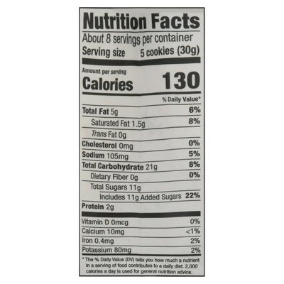Cookies baked to crunchy perfection. Per Serving: 130 calories. 1.5 g sat fat (total fat 5 g) (8% DV); 105 mg sodium (5% DV); 11 g sugars. 0 g trans fat. Peanut free. Certified peanut free facility. Gluten free. Mi-Del's story began in the 1940s when Samuel Midel sought to provide his family simple, wholesome, great tasting cookies. Over the years, Mi-Del has added cookie varieties and flavors but our founder’s vision remains the same - delivering delicious cookies your whole family can enjoy! Mi-Del's Gluten Free Chocolate Chip Cookies: Recipe combines just the right amount of organic chocolate chips, a gluten free flour blend and cane sugar and is baked to a crispy perfection. The result - an American classic cookie bursting with chocolatey flavor for a delectable treat! Our long history creating gluten free products makes these cookies perfect for those with gluten intolerance or seeking to lead a gluten free lifestyle. While we removed gluten, we did not compromise on taste! Taste why they're Mi-Delicious. midelcookies.com. For more information about Mi-Del cookies, or to find a store near you, snap the code or visit midelcookies.com. Mi-Del gives back. Mi-Del is committed to corporate social responsibility in the communities it serves. Each year. Mi-Del donates a portion of its proceeds and products to non-profits to facilitate their missions. Experience the wholesome goodness of other Mi-Del Gluten Free varieties: Ginger Snaps. Arrowroot Animal Cookies. Chocolate Sandwich Cookies. Royal Vanilla Sandwich Cookies. Product of Canada.