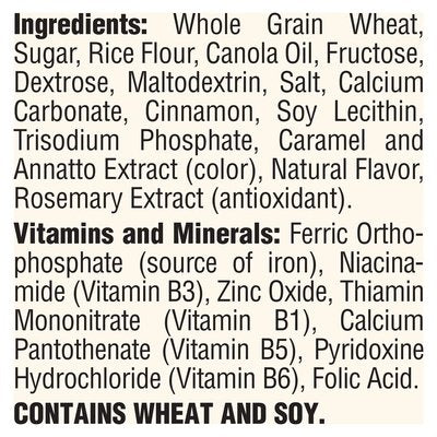 Sweetened whole wheat and rice cereal with cinnamon. No artificial flavors. 50% whole grain, 15 g or more per serving. 50% or more of the grain is whole grain. wholegrainscouncil.org. No synthetic colors. Mom's best cereals. How the best days begin. Simple Goodness Promise: We promise to make cereals that balance great taste, quality ingredients, and affordability. Everything you want in a cereal and nothing you don't. Mom's Best Guarantee: If you're not happy with the quality of this product, contact us for a refund. All we need is a best if used by date and a package UPC. Mom's Best Cereals: P.O. Box 1025, Lakeville, MN 55044. Call us at 1-866-465-4633 8am - 4pm (Central Time) weekdays, MomsBestCereals.com. MomsBestCereals.com. Be social with us! Facebook: MomsBestFanPage. Instagram: momsbestcereal. This carton is made from 100% recycled paperboard. (Minimum 35% post-consumer content). Carton made from 100% recycled paperboard. Minimum 35% post-consumer content. Made using renewable wind energy. We purchase wind energy credits to offset 100% of the electricity used to make the cereal in this box. Please recycle again!