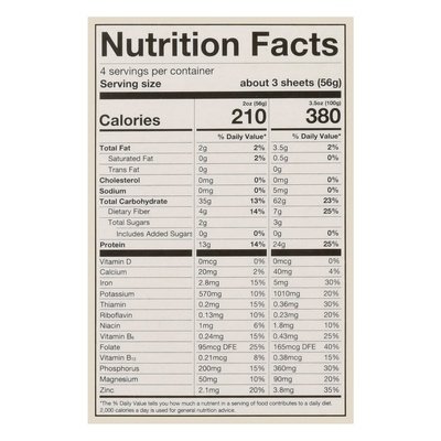 13 g protein (Per 2 oz serving). 4 g (per 2 oz serving) of fiber. Certified gluten free. gfco.org. USDA Organic. Vegan. Eco Cert: Cosmos Organic. Certified organic by Ecocert Canada. Non-GMO Project verified. nongmoproject.org. Non-GMO.