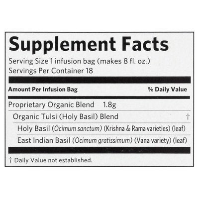 Herbal Supplement. USDA Organic. Vegan. Vegetarian. Gluten free. Certified Organic by Control Union-801983. Product produced and processed according to NPOP Standard of India & USDA-NOP. Halal. Caffeine free. Non GMO Project Verified. nongmoproject.org. Stress relieving & energizing. At the heart of Organic India is our commitment to be a living embodiment of love & consciousness in action. Small Family Farmers: Empowering small family farmers in India to cultivate regenerative, organic farmland. Revitalizing communities through fair wages, education, healthcare, access to clean water & job skills training. Regenerative Agriculture: Regenerating soil health & fertility. Improving water retention & sequestering carbon. Restoring vibrant health to the environment. Healthy Conscious Living: Celebrating the interconnectedness of life. Cultivating the health of our planet, our farmers & you. Pictured on the front is one of our beloved farmers or a family member. Revered in India as The Queen of Herbs, Tulsi (Holy Basil) is an adaptogenic herb that has been used for more than 5,000 years to: Aid in stress relief & uplift mood. Support the immune system. Support the natural detoxification process. Tulsi original three sacred varieties of spicy, powerful tulsi (Rama, vana and krishna) create a restorative, calming yet energizing infusion. Individually wrapped for freshness. OrganicIndiaUSA.com. www.controlunion.com. Certified B Corporation. Organic India is committed to responsible packaging. This carton is made from 100% recycled paperboard, with a minimum of 30% post-consumer content. Our infusion bags are made from unbleached, biodegradable fiber. Please support our environment by recycling this package. Fairtrade: Krishna tulsi, vana tulsi, rama tulsi: fairtrade certified & sourced from fairtrade producers. Total 100%. Visit www.info fairtrade.net. (These statements have not been evaluated by the FDA. This product is not intended to diagnose, treat, cure or prevent any disease). Product of India.