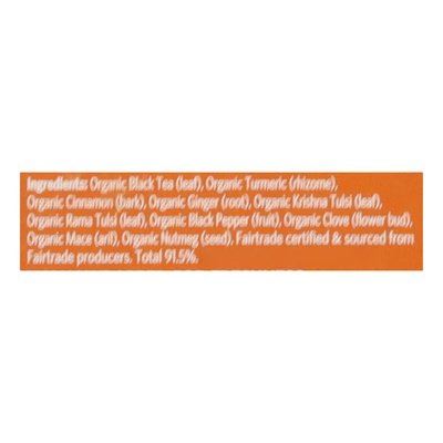 Herbal Supplement USDA Organic SGS Organic: Certified Organic as per NPOP by SGS India PVT. LTD. Processed & produced as per NPOP standard of India. Certified Organic by Control Union CU-801983. Product produced and processed according to USDA NOP standard. Vegan. Gluten free. Contains caffeine. Vegetarian. Non-GMO Project verified. nongmoproject.org. New. Meet Bashiran. Stress relieving & inspiring. Healthy conscious living. At the heart of organic India is our commitment to be a living embodiment of love and consciousness in action. All our products promote health and happiness and are made with loving care. Healthy conscious living from soil to shelf ensures that each of our products is testimony to the flow of love, respect and connection between Mother Nature, our farmers and you. Organic regenerative agriculture regenerates healthy soil and ecosystems, restores vibrant health to the environment and produces the highest quality herbs. Partnering with family farmers provides a life of dignity to our local farmers and their families and revitalizes communities through fair wages, education and healthcare. When you choose organic India products you actively participate in our mission to create a happier, healthier global environment. Organic India is committed to our earth seer standard, making choices that respect the health of our environment. Earth Seer: Ethical, authentic, reliable, trustworthy, holistic socially, environmentally, economically responsible. Tulsi Turmeric Chai: Take your Chai to the next level with a dose of peppery Turmeric and herbaceous Tulsi, the perfect union of sweet, earthy and spicy. Delicious on its own or with steamed milk to soothe the body and mind. Tulsi a powerful adaptogen holy basil. Reduces stress. Uplifts mood, builds stamina, promotes natural detoxification, improves digestion and metabolism, supports immunity, antioxidant effects. Throughout India Tulsi (holy basil) is called The Queen of Herbs and is revered as a sacred plant infused with healing powers. Tulsi's stress-relieving and life-enhancing qualities, noted in ancient Indian scriptures for over 5,000 years, are now here for you. Children also love our Tulsi! We wish you a life of good health and happiness. Individually wrapped for freshness. organicindiausa.com. Scan QR code on bottom of box to learn about our beloved farmers. Join the community (hashtag)HealthyConsciousLiving. Instagram. Facebook. Pinterest. Twitter. (at)organicindiausa. Certified B Corporation. Beginning with a single farmer in 1999, the organic India farmer partner community has grown to 2200+ farm families throughout India. Learn about the organic India difference by visiting our website or scan QR code. Certified Fair Trade by FLOCert. Fairtrade certified & sourced from Fairtrade produces. Total 91.5%. Visit info.fairtrade.net/sourcing. Organic India is committed to responsible packaging. This carton is made from 100% recycled paperboard, with a minimum of 30% post-consumer content. Our infusion bags are made from unbleached, biodegradable fiber. Please support our environment by recycling this package. (These statements have not been evaluated by the Food and Drug Administration. This product is not intended to diagnose, treat, cure, or prevent any disease.) Product of India. For export to USA.