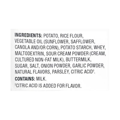 Gluten free. Certified Gluten-free. 50% less fat than fried chips (50+% less fat per 28 g serving: Sour cream & onion Popchips - 4.5 g. Regular fried potato chips - 10 g). Never fried. Always real. Half the fat of fried chips (50+% less fat per 28 g serving: Sour cream & onion Popchips - 4.5 g. Regular fried potato chips - 10 g). Full of flavor. Freedom to eat them all. The dip's already in the chip. Some things just go together: slip and slide, cut and paste, cookies and milk, and the most obvious, sour cream and onion. On their own, sour cream is tangy and onion is savory and slightly sweet. But together, they’re a dynamic duo - deliciousness together as one. Popped to perfection. Many chip-years ago, we turned the potato chip world upside down. We chose heat and pressure instead of grease and the deep fryer to create The Original Pop. The rest is delicious history. So grab a bag and enjoy, without snackrifice. Guaranteed fresh and flavorful through the "best before" date. popchips.com. Any questions visit popchips.com.