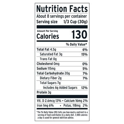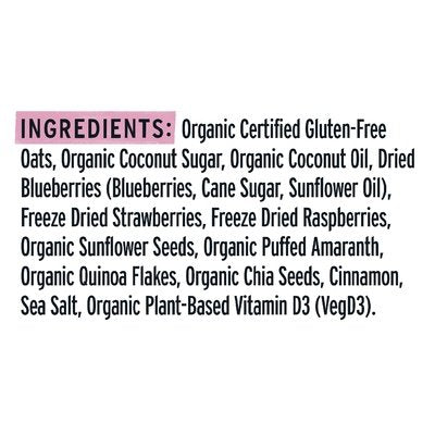 Salty-sweet crunchy clusters made with strawberries, raspberries & blueberries. No artificial flavors. NSF: Certified gluten free. Vegan. Certified Organic by: QAI. Good source of vitamin D (per 30 g serving). Non-GMO Project verified. nongmoproject.org. Elizabeth: Created to help you thrive. Recipe No. 31. The Purely Story: As a certified holistic nutrition counselor, I believe that nutritious food has a powerful effect on the body. When you eat better, you feel better. I started Purely Elizabeth to make food full of nourishing ingredients and delicious, culinary taste to help you thrive on your wellness journey. Enjoy! - Elizabeth, Founder & CEO. Full of The Good Stuff: We thoughtfully select plant-based, vitamin D3 for our Berry Crisp Ancient Grain Granola. Each serving provides a good source of vitamin D (per 30 g serving). Our Purely Guarantee: Don't love it? Send us an email at support(at)purelyelizabeth.com. purelyelizabeth.com. Scan for recipes + exclusive rewards! Facebook. Pinterest. Instagram. Certified B Corporation. Woman owned.