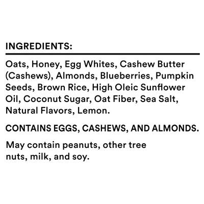 Soft + crispy cashew butter bar. 10 g. protein bar. Gluten free. 3 tbsp oats. 5 cashews. 2 egg whites. 2 tsp honey. No B.S. Oats, nut butter and honey for a soft yet crispy texture. Egg whites for protein. Simple ingredients for A.M. energy. No fillers. No B.S. Quantities of ingredients listed on front determined by net weight. www.rxbar.com. 321.624.8200.