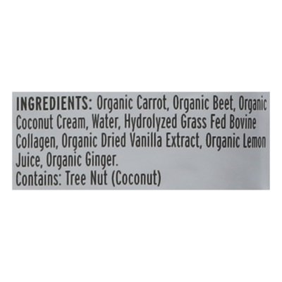All ages. 6+ months. Beet & carrot with organic coconut cream, lemon & ginger. 5 g protein. 6 g fat. Dairy-free. USDA Organic. Certified Organic by Oregon Tilth. Grass fed + collagen. Serenity Kids because every bite counts. Collagen is the body's most abundant protein and plays an essential role in whole body function & growth. High quality ingredients. Organic spices. Organic coconut cream. Organic vegetables. www.myserenitykids.com. Contact(at)myserenitykids.com. 512-537-8847. Terracycle. BPA-free package. Family owned & made in the USA.