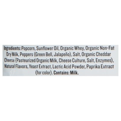 Flavored popcorn with other natural flavors. No artificial flavors. 47 calories per cup. Certified gluten free. Gluten free. 100% Whole Grain - 18 g or more per serving. 100% of the grain is Whole Grain. WholeGrainsCouncil.org. Peanut free. Tree nut free. Non-GMO Project verified. nongmoproject.org. Pure popped perfection. New! Real cheese rBST-free (No significant difference has been shown between milk derived from rBST-supplemented and non-rBST supplemented cows). Skinny pop popcorn. We kicked our real cheddar cheese up a notch by adding a pop of jalapeño to create our boldest popcorn yet. And as always, we used the fewest, cleanest and simplest ingredients possible. That's the skinny! skinnypop.com Facebook. Twitter. Instagram. 833 8-POPCORN.