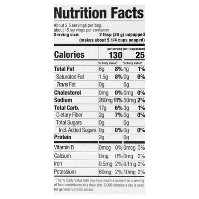 No artificial flavors. 25 calories per cup. Certified Gluten-Free. Certified Vegan. vegan.org. Gluten free. Dairy free. Peanut free. Tree nut free. 100% Whole Grain: 23 g or more per serving. Eat 48 g or more of whole grains daily. WholeGrainCouncil.org. Zero trans fat. Non GMO Project verified. nongmoproject.org. Non GMO. About 2.5 servings per bag. New! No artificial ingredients. Chemical free lined bags. Made with responsibly sourced palm oil. Preservative free. No PFOAs. No diacetyl and delicious! skinnypop.com. Try our new! microwave popcorn bag today! Popped skinny in the USA.