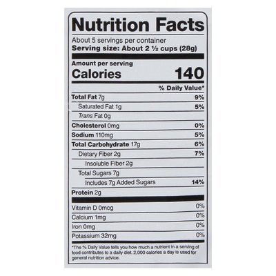 No artificial flavors and delicious! Per Serving (about 2-1/2 cups): 140 calories; 1 g sat fat (5% DV); 110 mg sodium (5% DV); 7 g sugars. 56 calories per cup. Certified gluten free. Certified vegan. Vegan.org. 50% Whole Grain: 12 g or more per serving. 50% or more of the grain is whole grain. WholeGrainsCouncil.org. See back panel for nutritional information. Non-GMO Project verified. nongmoproject.org. New & improved flavor! No artificial ingredients. Preservative free. Enjoy your favorite SkinnyPop popcorn with a sweet & salty crunch. We believe in snacking without compromise. To us, that means using the fewest leanest and simplest ingredients possible to bring you the best tasting popcorn. That's the Skinny! skinnypop.com. Facebook. Twitter. Instagram. Pinterest. Snack with Skinny Pop: Mini Cakes; Popcorn; Microwave. Made with 100% SkinnyPop Popcorn and always delicious! Popped Skinny in the USA.