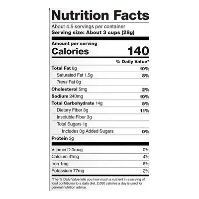 No artificial flavors. 47 calories per cup. Gluten free. Certified gluten-free. Peanut free. Tree nut free. 100%+ Whole Grain: 56 g or more per serving. 43% or more of the grains is whole grain. WholeGrainsCouncil.org. See back panel for nutritional information. Zero trans fat. A good source of fiber and delicious! Non GMO Project verified. nongmoproject.org. Pure popped perfection. No artificial ingredients. Made with real cheese. Real cheese rBST-free (No significant difference has been shown between milk derived from rBST-supplement and non-rBST supplement cows). Preservative free. We know your flavor big and your cheddar cheese aged. So here it is - our boldest, cheddar-iest popcorn yet - using the fewest, cleanest and simplest ingredients possible. That's the Skinny! Pure popped perfection. skinnypop.com. Facebook. Twitter. Instagram. Pinterest. Try all the new ways to snack with Skinny Pop: Mini Cakes; Puffs; Popcorn; Microwave. Made with 100% SkinnyPop Popcorn and always delicious! Popped Skinny in the USA.
