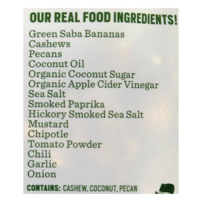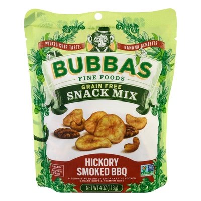 A surprising blend of savory kettle cooked banana chips & premium nuts. Gluten Free. Paleo. Vegan. No added sugar (Not a low calorie food. See nutrition information for sugar and calorie content). No soy. No dairy. Non GMO Project verified. nongmoproject.org. Potato chip taste. Banana benefits. Low glycemic prebiotics. Savory saba banana. Looking for the hard-to-pronounce ingredients? There's nothing but real food here. These snacks may taste naughty, but Bubba only picks ingredients that play nice. Hand crafted in small batches. Made with nutrient dense coconut oil. Oh hey, still searching for the hard-to-pronounce ingredents? None here either, but we admire your curious nature. Turn bag over for snacks. bubbasfoods.com. bubbasfoods.com/bottom Twitter. Facebook. Instagram. (at)bubbasfoods. Visit bubbasfoods.com/bottom for something fun from us. Enjoy our 'Nana chips and ungranolas too!