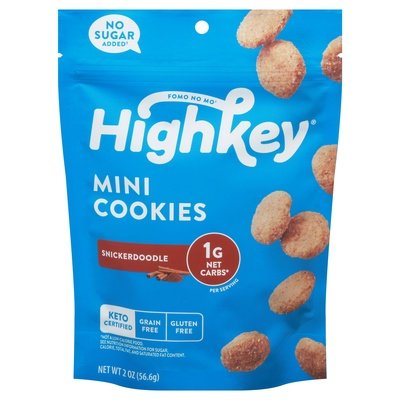 1 g keto certified net carbs (9 g total carbs - 2 g dietary fiber - 6 g erythritol = 1 g net carbs per serving) per serving. Gluten free. Certified gluten free. Keto certified. No sugar added (Not a low calorie food. See nutrition information for sugar, calorie, total fat, and saturated fat content). Grain free. Fomo no mo. Cinna-yum! You butter believe you won’t be able to but this bag down once you tear it open! Our melt-in-your-mouth snickerdoodle mini cookies are the perfect blend of cinnamon, vanilla and yes butter! Get ready to lick your lips and dig in. highkey.com. Facebook. Instagram. Pinterest. Twitter.