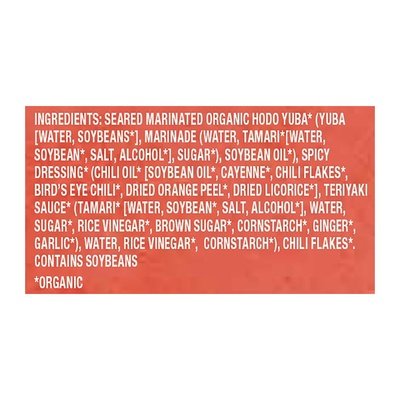 No artificial flavors. 16 g protein per serving. USDA Organic. Gluten free. Vegan. Certified Organic by COOF. Plant protein. Zero cholesterol. High protein. Excellent source of fiber & calcium. Good source of iron. Organic is Non-GMO & more. Plant-based. Fully cooked. Spice so Nice: Hidden inside this package, you'll discover one of the most magical foods on the planet - hand - cut Yuba strips tossed with a zesty house made teriyaki sauce. Outrageously delicious with just the right level of spice. Plus, ready to eat straight from your fridge! Ready to Eat: Eat cold or hot. Stir fry with veggies. Toss into a salad. 100% delicious! Obsessed with Delicious: Hodo handcrafts delicious, wholesome, organic plant-based foods for people who love to eat well. We thoughtfully source every ingredients and use artisanal methods. Proudly based in Oakland, California. Get inspired at hoodfoods.com/recipes. Please recycle.