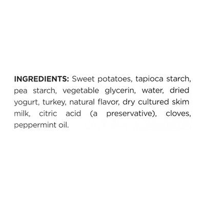 With turkey accented with cloves + peppermint oil. No artificial preservatives, colors, or flavors ever fur real. Chewing supports clean teeth. Helps with smoochy fresh breath. Grain free. No corn, wheat, soy, or rice. Just like we like it. Free of any fillers or animal by-products. Fresh paw prints of bel air. Dreamed up in Boulder, CO by real fun pet people. 5 small chews for small to medium dogs. Meet Your New Best Friends: The best love is the best food, and the best food should be available to All furry friends. We celebrate the incredible bond between human and pet. It's why we're called I and love and you. We are pet parents too-the type who bring their pets to work. We started small, in a pet food store in Boulder, Colorado, creating raw food for pets before healthy pet food was a thing. We're still independent and employee-owned, but our dream has grown into a mission: to help all pets live happier, healthier lives. Yeah, we're obsessed; just living up to our name. Our super tasty recipe. We did the math for you. Woohoo! Made with real turkey. The act of chewing supports clean teeth. Limited ingredients. Nothing weird that's what's up. Great Taste Guarantee: Wags/Purrs/High Fives guaranteed. If you or your pet aren't 100% happy with this product, please let us now and we promise we'll make it right. We'd pinky swear if, like, pets had fingers. iandloveandyou.com. Facebook. facebook.com/iandloveandyoupet. Instagram. (at)iandloveandyoupet. We'd love to hear from you. questions(at)ilypet.com. Call us 855.459.5683.