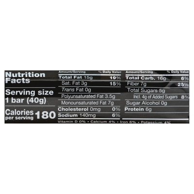 5 g sugar. 6 g protein. 0 g trans fat. 15 g fat per bar. Gluten free. Low sodium. Low glycemic index. No sugar alcohols. High in fiber. No genetically engineered ingredients. No. 1 ingredient heart healthy almonds. Ingredients you can see & pronounce. Do the kind thing for your body, your taste buds & your world. 59% nuts. kindsnacks.com. Made in USA with domestic and imported ingredients.