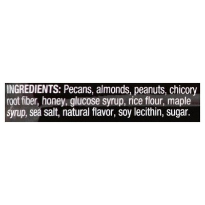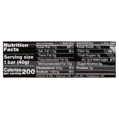 5 g sugar; 5 g protein. 0 g trans fat. 17 g fat per bar. Gluten free. Dairy free. Low sodium. Low glycemic index. No sugar alcohols. Good source of fiber. No genetically engineered ingredients. No. 1 ingredient heart healthy pecans. Ingredients you can see & pronounce. Do the kind thing for your body, your taste buds & your world. 73% nuts. kindsnacks.com. Made in USA with domestic and imported ingredients.