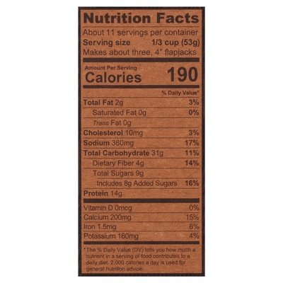 14 g protein per serving. Crafted with 100% whole grains. Protein-packed. Just add water. Whole grains taste better. Restoring the Flapjack Tradition: Way back when, lumberjacks and pioneers relied on food packed with protein and essential nutrients from whole grains to get them through long days on the frontier. Though most of us have traded in our axes for laptops, we still crave delicious, nourishing food. Kodiak Flapjack and Waffle Mix is meant for those of us who, like the rugged pioneers exploring the untamed wilderness, require nutrition and great taste to successfully navigate today's frontier. kodiakcakes.com. Instagram. Twitter. Facebook. YouTube. Pinterest. Forage for more recipes at kodiakcakes.com. Nourishment Today's Frontier: Kodiak started out of a red wagon. Learn our story and join our adventure at kodiakcakes.com. We can tell you like to get to the bottom of things. Learn more about our story at kodiakcakes.com. Grizzly Bear and Wildlife Foundations: We're committed to keeping the frontier wild for future generations. Your purchase helps us support foundations that protect grizzly bears and other wildlife habitats around the country. Be sure to try our Toaster Waffles, Baking Mixes, and Oatmeal. Carton made with recycled paper. Please recycle.