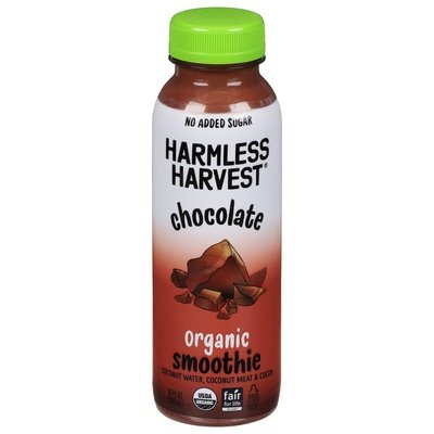 Coconut water, coconut meat & cocoa. USDA Organic. No added sugar. Coconut smoothie, but make it chocolate. The Base: We blend our hydrating coconut water with coconut meat to create an oh-so-creamy smoothie. The Taste: Rich, chocolatey decadence from organic cocoa. Our Promise: Less harm. More good. We've got a whole team in Thailand where the coconuts grow. They make sure we farm and bottle to the highest standards. For export only. harmlessharvest.com. Learn more: harmlessharvest.com. 100% recycled plastic bottle (Bottle made from 100% recycled pet. Excludes cap and label). BPA free. Fair for Life: Fair trade certified by IMO. This certification means we're serious about fair trade and social progress. We're not perfect, but we wake up every day with the intention of doing less harm and more good. Product of Thailand.