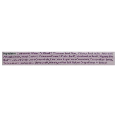 4 g of sugar per can. Certified Gluten-free. Vegan. Paleo. Non GMO. Non GMO Project verified. nongmoproject.org. Supports digestive health. Prebiotics. Botanicals. Plant fiber. Plant powered microbiome approved. We've spent years crafting a drink that's as good for your digestion as it is delicious. Olipop combines the benefits of prebiotics, plant fiber and botanicals in a sparkling tonic that supports your microbiome and benefits digestive health. We're giving grape an upgrade. Made from real concord grape juice with a hint of lime to create the perfect blend of sweet and tart, our Classic Grape is the nostalgic flavor you know and love - all grown up. www.drinkolipop.com. Please recycle.