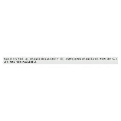 Lemon caper mackerel in organic extra-virgin olive oil. How to Enjoy Our Mackerel: A great pantry staple for pastas or salads, seasoned with lemon and capers and packed in extra-virgin olive oil. The seasonings are on the bottom, so flip the can onto a plate so they flow evenly over the fish. Why Mackerel: A mild, meaty smaller fish, Atlantic mackerel are an excellent source of protein and vitamin B-12. Ours swim in immense schools off the coast of northern Spain, and by choosing to eat these fish, we're taking the pressure off less abundant species like tuna. We're also supporting local fishing families who use traditional hook and line techniques, which means almost no bycatch. More information inside. Certified B Corporation. 1% for the planet. We're in business to save our home planet. Recycle. Reuse. FSC - Mixto. Product of Spain.