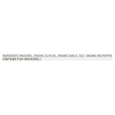 Roasted garlic mackerel in olive oil. How to Enjoy Our Mackerel: A great pantry staple for pasta or salads, seasoned with lemon and capers and packed in extra-virgin olive oil. The seasonings are on the bottom, so flip the can onto a plate so they flow evenly over the fish. Why Mackerel: A mild, meaty smaller fish, Atlantic mackerel are an excellent source of protein and vitamin B-12. Ours swim in immense schools off the coast of northern Spain, and by choosing to eat these fish, we're taking the pressure off less abundant species like tuna. We're also supporting local fishing families who use traditional hook and line techniques, which means almost no bycatch. More information inside. Certified B Corporation. 1% for the planet. Product of Spain.