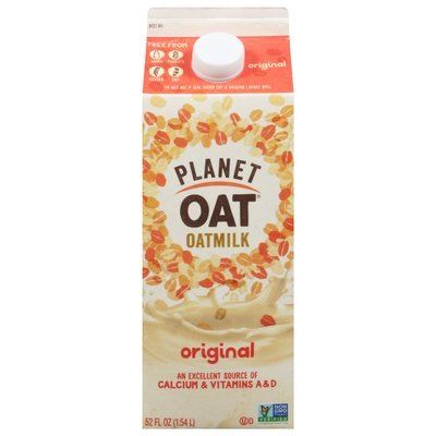 Free from: Dairy; peanut; gluten; soy; lactose; tree nuts; artificial flavors; artificial colors; artificial preservatives. An excellent source of calcium & vitamins A & D. Non-GMO Project verified. nongmoproject.org. Welcome to Planet Oat! What's Planet Oat? For us, it's the place where the whole world revolves around oats. We're super passionate (some might say obsessed) with sharing the mighty little oat with you! Oats pack a lot of punch for such a small package and - most importantly - they're delicious! So to celebrate the awesomeness of this mighty little oat, we bring you this rich, creamy, full-bodied beverage that's dairy free, peanut free, soy free and gluten free. Bring us your glasses, cereal bowls, coffee, and smoothies, and let us show you what Planet Oat oatmilk can do for you!! Out of this world delicious & nutritious! Ultra-pasteurized. Ultra-pasteurized this product is ultra-pasteurized to maintain the quality of the product longer unopened. Instagram. Facebook. Pinterest. We welcome your comments and questions. When writing, please include the product size and type along with the date printed on the top of the carton. Write to: Consumer Affairs. HP Hood LLC, Six Kimball Lane, Lynnfield, MA 01940 or Call 1-800-242-2423. Try all of our flavors! Planet Oat OatMilk Dark Chocolate; Planet Oat OatMilk Extra Creamy Original; Planet Oat OatMilk Vanilla.