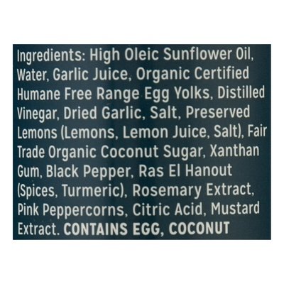 Savory garlic with hints of preserved lemon and warm spices. This product is Keto Certified. ketocertified.com. Certified Paleo. Gluten free. Dairy free. Non GMO Project Verified. nongmoproject.org. Morocco inspired. Better every bite. Globally inspired. New York admired. how2recycle.info. Thoughts? DM us (at)sirkensingtons. Certified B Corporation. This is the part of the label where we tell you to try our other amazing products like our award-winning Spicy Brown Mustard. Try this on: Fries. Pizza. Burgers. Sandwiches. Veggies. Bottle made with 50% recycled plastic. Certified Humane: Raised & handled.