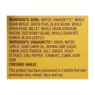 Beans, quinoa & millet medley with wheat berries, peas and raisins with citrus turmeric vinaigrette. Spork included. 12 g plant protein. 12 g protein. High fiber (8 g Total fat per bowl). 100% of the Grain is whole grain. 42 g or more per serving. WholeGrainsCouncil.org. Vegan. Non-GMO project verified. nongmoproject.org. Our delicious lime of globally inspired, ready-to-eat grain & bean protein bowls deliver 12+ grams of protein. Enjoy at home at work, or on-the-go. You can heat and eat or eat as-is. Kosher Inspection Service Certified. tastybite.com. Something on your mind? Comments (at)tastybite.com. please include the code for this product in your email. For more Tasty Bite products. Visit tastybite.com. BPA-free microwavable bowl. Product of India.