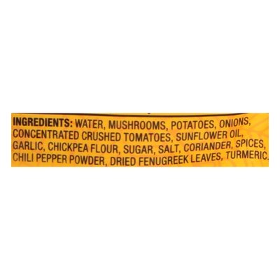 Hearty mushrooms & potatoes prepared in a richly spiced sauce. Vegan. Gluten free. Non GMO Project verified. nongmoproject.org. All natural. Microwavable 60 seconds. No artificial colors, flavors or preservatives. Kosher Inspection Service certified. tastybite.com. For quick meal ideas, visit tastybite.com. Something on your mind? comments(at)tastybite.com. Please include the code for this product in your email. BPA free. Product of India.