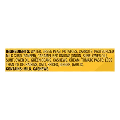 Vegetables & paneer cheese simmered with spices & cashews. No artificial flavors. Vegetarian. Gluten free. Kosher Inspection Service Certified. Vegetarian. Non-GMO Project verified. nongmoproject.org. Microwavable 60 seconds. No artificial colors or preservatives. tastybite.com. For quick meal ideas, visit tastybite.com. Something on your mind? comments(at)tastybite.com. Please include the code for this product in your email. BPA free. Product of India.