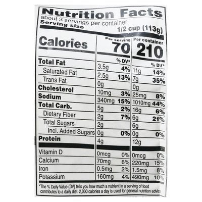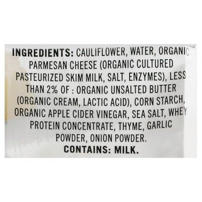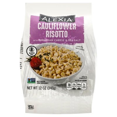 With parmesan cheese & sea salt. Per 1/2 Cup Serving: 70 calories; 2.5 g sat. fat (13% DV); 340 mg sodium (15% DV); 2 g total sugars. Gluten free. Non GMO Project verified. nongmoproject.org. Expertly seasoned. A side of elegance for special meals, a delicious choice for every day. Flavorful riced cauliflower laced with aged parmesan cheese. Aged parmesan. www.alexiafoods.com. how2recycle.info. Smartlabel: Scan or call 1-866-479-3958 for more food information. Have a question or comment? Visit us at alexiafoods.com or call Monday-Friday 1-866-479-3958 (except national holidays). Please have entire package available when you call.