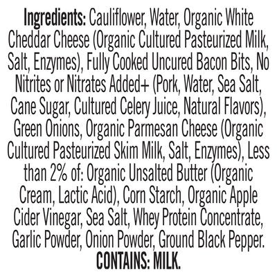 Per 2/3 Cup Serving: 90 calories; 3 g sat fat (15% DV); 360 mg sodium (16% DV); less than 1 g total sugars. Gluten free. All natural (No artificial ingredients, minimally processed). Twist on a classic. Cook thoroughly. Go ahead and enjoy this extraordinary twist on a comfort food classic. We’ve loaded cauliflower florets with smoky uncured bacon, bright green onion and rich white cheddar cheese sauce to create a satisfying savory side. Crispy uncured bacon. U.S. inspected and passed by Department of Agriculture. www.alexiafoods.com. how2recycle.info. SmartLabel: Scan or call 1-866-479-3958 for more food information. Have a question or comment? Visit us at alexiafoods.com or call Monday-Friday 1-866-479-3958 (except national holidays). Please have entire package available when you call.
