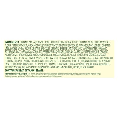 Asian dumplings in a savory hoisin sauce. Certified Vegan. vegan.org. Dairy free. Certified Organic by QAI. If it's organic it's non GMO. Plant based. Microwave or regular oven. From our home to yours. Amy's Asian Dumpling Bowl was inspired by a dish we tried on one of our trips through Singapore. After years of work in our chef's test kitchen, we've crafted our own version of this savory dish using organic garlic, onions, carrots and ginger, carefully folded into delicate dumplings. Then we gently lay them on top of organic noodles and our special house-made tofu. We finish off the dish with a rich and savory hoisin sauce that will surely leave you smiling. Amy's Kitchen does not use any peanuts, fish, shellfish or eggs. Family Owned Since 1987: After the birth of our daughter Amy in 1987, we found there was little time to prepare the quality homemade food we normally ate. Realizing there were others like ourselves, we started Amy's Kitchen to prepare delicious meals for those who care about the food they eat but are often too busy to cook. We use only the finest ingredients and prepare them with the same careful attention in our kitchen as you would in your own home. No meat, fish, shellfish, poultry, eggs or peanuts are ever used in any Amy's products. how2recycle.info. amys.com. We love to cook for you. amys.com. Amy's Soups Thai Curry Sweet Potato Lentil. Look for us in the soup aisle! Certified 100% recycled paperboard.