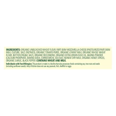 Certified organic by Quality Assurance International (QAI). No GMOs: no genetically engineered ingredients. Microwave or regular oven. From our home to yours. Amy's Cheese Pizza Snacks give you all the fun and flavor of pizza without the hassle of preparation and serving. They're easy to hold and easy to eat! Inside the light tender crust made with organic flour you'll find a delicious filling - Amy's own house-made pizza sauce and mozzarella cheese. And of course - kids love 'em! Family owned since 1987. After the birth of our daughter Amy in 1987, we found there was little time to prepare the quality homemade food we normally ate. Realizing there were others like ourselves, we started Amy's Kitchen to prepare delicious meals for those who care about the food they eat but are often too busy to cook. We use only the finest ingredients and prepare them with the same careful attention in our kitchen as you would in your own home. No meat, fish, shellfish, poultry, eggs or peanuts are ever used in any Amy's products. Amys.com. how2recycle.info. We love to cook for you. Amys.com. Certified 100% recycled paperboard.