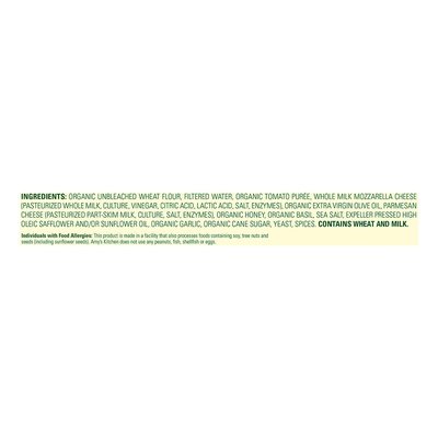 Thin crust topped with mozzarella. Certified organic by Quality Assurance International (QAI). No GMOs: Genetically engineered ingredients. From our home to yours. When Amy's mother, Rachel, and uncle, Joel, were kids back in the '60s, their parents took them to Italy. The first thing they wanted to eat when they got there was, of course, pizza - in Naples they found what they were looking for-not exactly like the ones back home, but delicious and recognizably pizza. Forty years later, when Amy's grandmother first tried Amy's Margherita Pizza, she said, somehow this tastes familiar. When our cook explained that this pizza was based on the original Pizza Napoletana, she laughed and said, of course - this is like what we ate in Naples. The simple sauce is made with organic tomatoes, and the crust is thinner than our usual crust. Best of all are the toppings - organic tomatoes, along with mozzarella, Parmesan and organic basil. The simple, crisp flavors of this classic pizza are hard to beat. Family owned since 1987. After the birth of our daughter Amy in 1987, we found there was little time to prepare the quality homemade food we normally ate. Realizing there were others like ourselves, we started Amy's Kitchen to prepare delicious meals for those who care about the food they eat but are often too busy to cook. We use only the finest ingredients and prepare them with the same careful attention in our kitchen as you would in your own home. No meat, fish, shellfish, poultry, eggs or peanuts are ever used in any Amy's products. Amys.com. how2recycle.info. We love to cook for you. Amys.com. Try our wide variety of flavorful options, from delicious meals & soups to burritos & salsas. Certified 100% recycled paperboard.