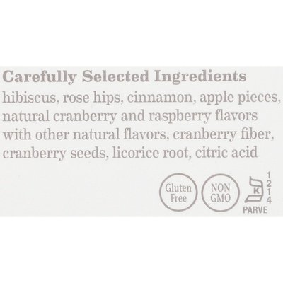 Tart cranberry with a warm spice finish. Gluten free. Caffeine free. Caff-O-Meter (Represents average caffeine content; individual products may vary) Content per Serving: 0 mg. Non GMO. America's classic. Family tea blenders since 1945. Tea bags individually wrapped in foil pouches. Freshness stays in. Air and moisture stay out. The taste the flavor of the season. Taste will always be our family's number one priority. You can always count on superior quality and ingredients which is what makes every cup of Bigelow tea so special. We are excited to be adding a new flavor to our Harvest Seasonal Tea Collection. Cranberry Harvest is masterfully blended with the tart flavor of cranberries and a warm autumnal spice finish. We feel this new flavor truly represents the beauty of the Harvest Season. We hope you agree. Protected in foil - because flavor matters. Our family selects ingredients so carefully that they must protect them in foil to allow you to experience their full flavor; freshness; aroma. Bigelow limited edition teas. Our family is proud of our recipe: Each ingredients below has been carefully selected by the Bigelow family to deliver an uncompromised tea experience. Our Promise: We love to hear what you have to say. If you do call our Consumer Services Crew please reference the code on our box. bigelowtea.com. (hashtag)TeaProudly. Certified B Corporation. Our tea bags are compostable. Our folding cartons are recyclable. Proud to be: zero-landfill company. Manufactured in the USA. 100% American family owned. Blended and packaged un the U.S.A. Taste the Flavor of the Season