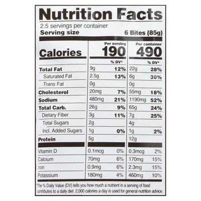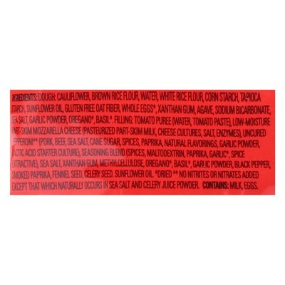 Gluten free always. Certified gluten free. gfco.org (Certified gluten-free by gluten-free certification organization, www.gfco.org). Good source of fiber (No nitrates or nitrites added except those naturally occurring in sea salt and celery juice powder). Contains 0 g of total fat per serving see nutrition information for fat content. Ready in minutes. Love at first bite! Not ready to eat. Drumroll please. Caulipower Pizza Bites are here! After three years of trying to make the perfect alternative to a childhood fave, we finally did it. Baked (never fried) with our signature cauliflower crust and gluten free always. Finally, there's a pizza bite you can feel great about giving your kids. And even sneaking one from their plate;) - Gail Becker, founder, Caulipower. Brought to you by Caulipower a vegolutionary foods brand. Inspected for wholesomeness by U.S. Department of Agriculture. eatcaulipower.com. Follow us on social (at)caulipower Join the Vegolution! Taste our other products. Resealable.