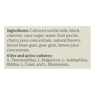 Greek yogurt black cherry on the bottom. No artificial flavors or sweeteners, no preservatives. No gluten. Billions of probiotics. Protein rich. Only natural ingredients. Black Cherries in glittering bushels. Sweet, supple gemstones - singing, breathing, bursting black cherry. Plucked and delivered proudly, tenderly, to you. Authentically Crafted: No fake fruit, no rBST (Milk from rBST-treated cows is not significantly different). Grade A. chobani.com. how2recycle.info. Questions or comments? 1-877-847-6181. Certified 100% recycled paperboard.