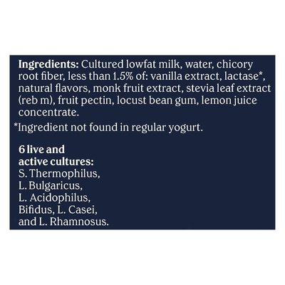 Vanilla with other natural flavors. 20 g protein. 0 g added sugar. 0 lactose. 3 g fiber. Lowfat. Gluten-free. 1% milkfat. 9 essential amino acids. This yogurt is advanced. Chobani Complete solves the nutrition puzzle with fiber, complete protein, and 0 g added sugar. It's advanced nutrition yogurt that's lactose-free and easy to digest. With real vanilla. Prebiotic. Probiotic. Grade A. chobani.com. Questions or comments? 1.877.847.6181. Tear off label and recycle bottle.
