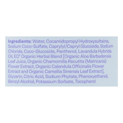Body wash, bubble bath, shampoo with calendula, chamomile, and aloe vera. Everyone - for everybody. Nourishing + multitasking. Real good stuff inside! We say nope to fake fragrances, dyes and fillers. And yep to quality ingredients and plant extracts that are vegan and cruelty free. Why? Because we believe in making good products that everyone can enjoy. For us, that's botanical body care that's better for you and for the planet. Smell like real lavender and aloe vera (because it is!). Nope! No parabens, dyes, phthalates. No synthetic fragrance. No sketchy fillers. No harsh chemicals. No worries! Yep! Hypoallergenic + dermatologist tested. Plant extracts + pure essential oils. Vegan+cruelty-free. Family-owned. Made with love! Lather on the love with our gentle and multitasking body wash, bubble bath and shampoo. Everyone is welcome. EWG verified. For your health. ewg.org. eoproducts.com. Follow us: Instagram: everyoneproducts. Certified B Corporation. 100% PCR. Cruelty free. No animal testing. 100% recycled bottle. Please recycle. Made in the USA from domestic and globally sourced components.