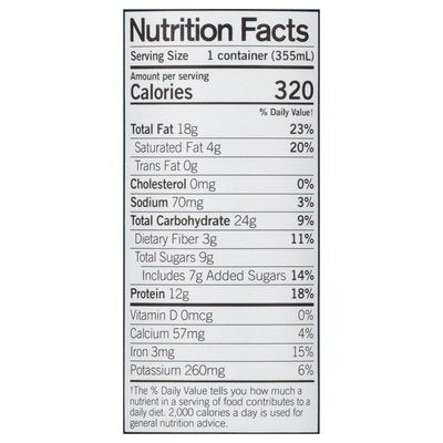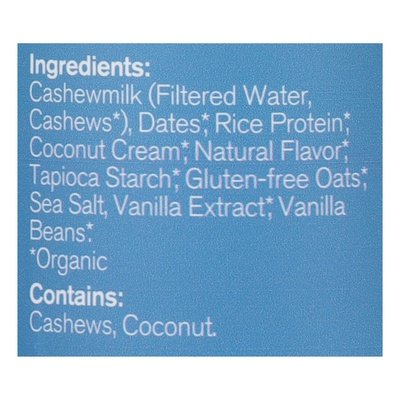 Dairy-free cashewmilk shake. 12 g protein. USDA Organic. Dairy-free. Certified vegan. Vegan.org. Certified Organic by CCOF. Non-GMO & more. Sweetened with dates stevia-free. foragerproject.com. Please recycle.