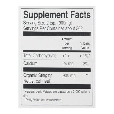 Herbal supplement. USDA Organic. Certified organic. Certified Organic by QAI. Member owned since 1976. Responsible to people and planet. Cut & sifted. Urtica dioica. Non-irradiated. www.frontiercoop.com.