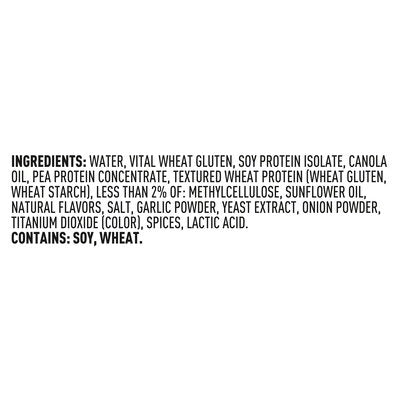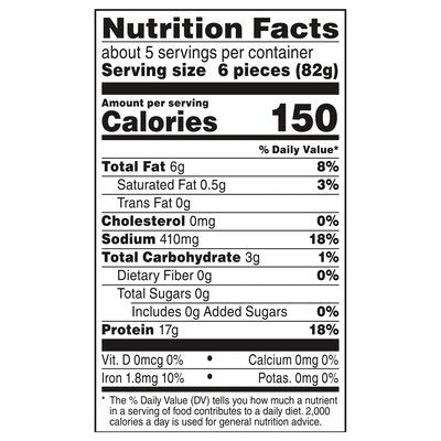 17 g protein per serving. Per 6 Pieces: 150 calories; 0.5 g sat fat (3% DV); 410 mg sodium (18% DV); 0 g total sugars. Vegan. Non-GMO Project verified. nongmoproject.org. Plant-based. The Ultimate Plant-Based Chick'n Strips: Whether you're making a quick snack, salad for lunch or meal to feed your whole family, Gardein Ultimate Plant-Based Chick'n Strips are the perfect addition to any recipe! Seasoned and cooked to perfection, we promise you won't miss the real thing! www.gardein.com. how2recycle.info. SmartLabel: Scan for more food information or call 1-877-305-6777. Questions or comments, visit us at www.gardein.com or call 1-877-305-6777.