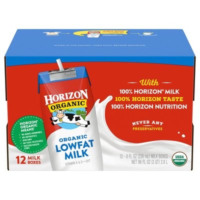 8 g protein per serving. USDA Organic. Certified Organic by Quality Assurance International. Lowfat. Vitamin A & D. UHT. Non-GMO. Horizon Organic Means (Per National Organic Program Regulations. Organic rules prohibit the use of pesticides that are harmful to human health): no added hormones; no antibiotics; non-GMO; no toxic pesticides; pasture-raised cows. With 100% horizon milk; 100% horizon taste; 100% horizon nutrition. Never any preservatives. 100% delicious! UHT processed for longer shelf life. Can be stored unrefrigerated. Proud member of Danone Family. Grade A. horizon.com. how2recycle.info. We'd love to hear from you! Call 1-888-494-3020 or visit horizon.com. Certified B Corporation. Airtight milk box. Locks in great taste!